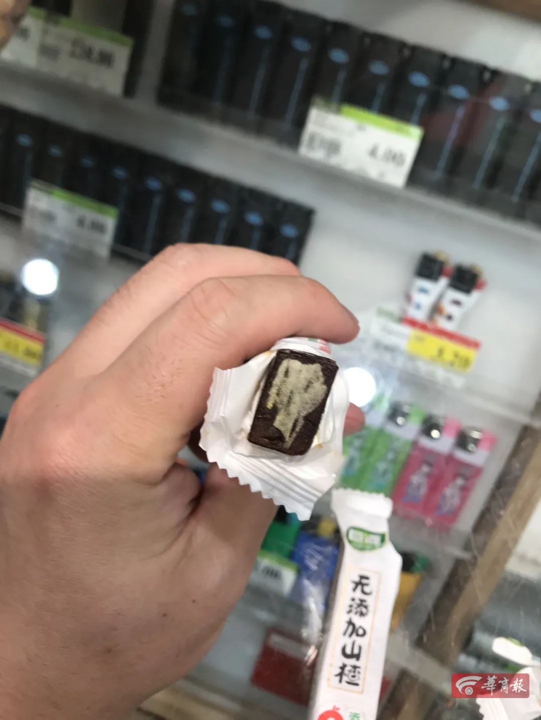 在付款的时候,收银员说有一个五香花生米的价钱不对,让去服务台处理,“我到服务台一边等待工作人员处理,一边就打开买的山楂条吃。”刘先生说,他剥开第一个山楂条的包装就发现长毛了,现场还给服务台的人看了,然后一连剥了几个,都有发霉长毛的现象。