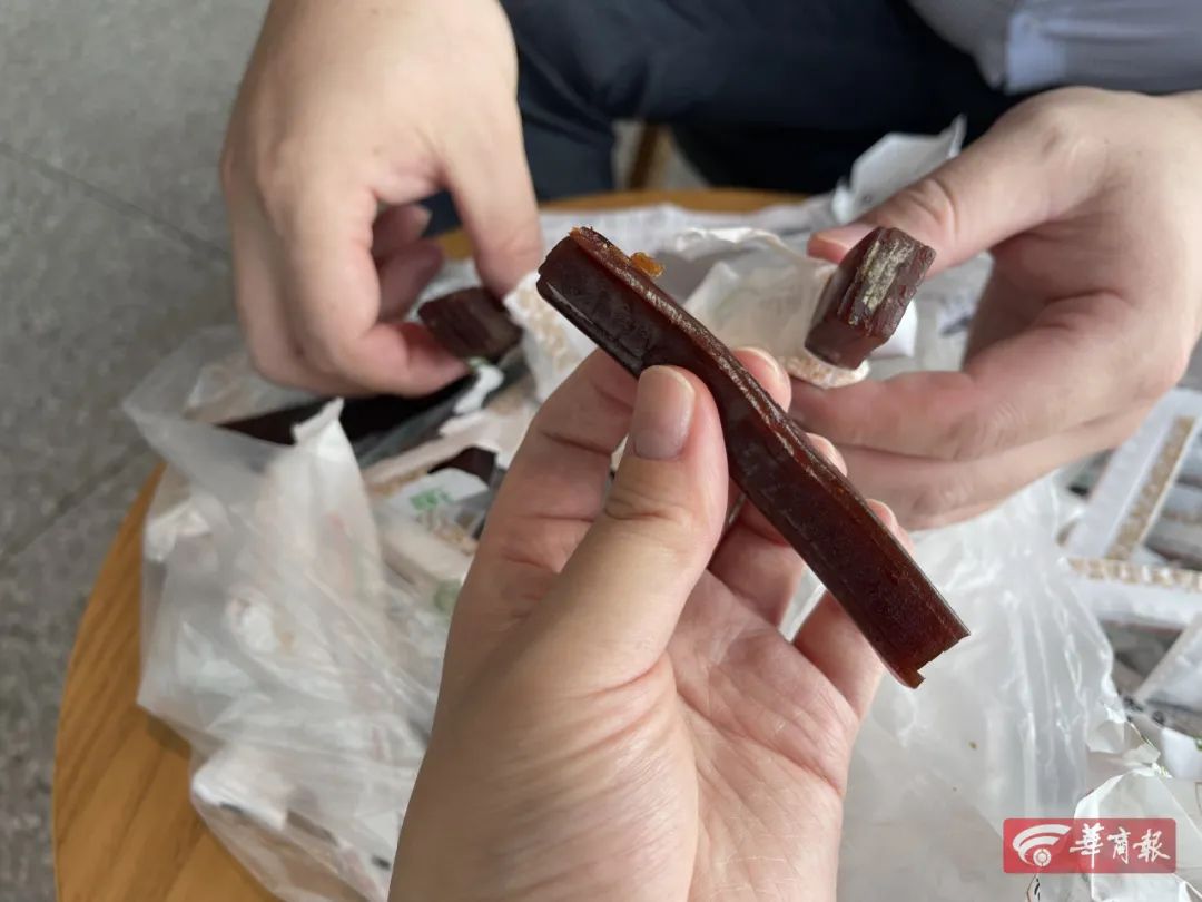 这款名叫巨源牌的山楂条外包装打着“无添加山楂、无防腐剂、无色素、无香精”等字样。现场记者要求刘先生再剥几个试试,发现有一个山楂条在外包装完好的情况下,剥开后的山楂条有发绿发黑的情况,该山楂条的生产日期为2020年12月15日,也是在保质期内的。