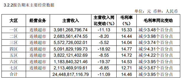从今年一季度经营业绩看,永辉净利润仅有0.23亿元,史诗级暴跌98.51%。毫无疑问,报告期公司各区连锁超市经营业绩均出现了大跌。而公司当期实现营业总收入为263.34亿元,同比下降了9.99%。