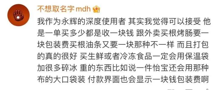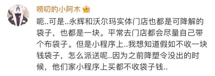 所以永辉超市这次事件,与禁塑令无关,问题的关键在于,永辉事先未征得消费者同意,对每笔订单收取了1元的包装费。