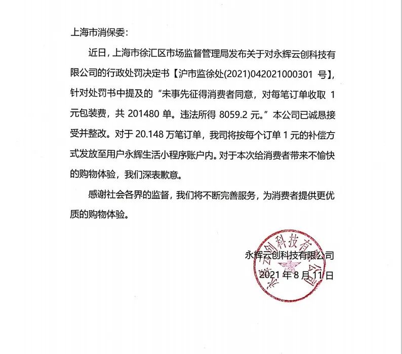 8月10日,永辉超市官方微博发布致歉声明称,高度重视“永辉生活小程序收取1元包装费”问题,对给消费者带来的不便及其引发的社会关注,表示诚挚的歉意。(此前报道)