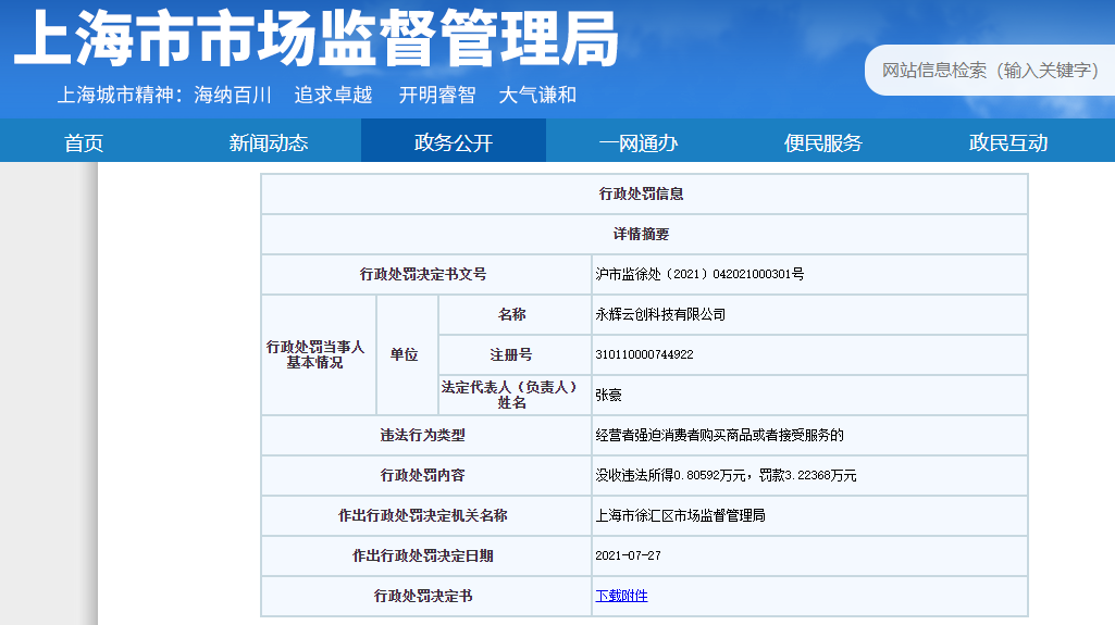 行政处罚决定书显示,永辉云创科技有限公司自2021年1月1日起至2021年2月28日,通过微信小程序“永辉生活+”,对201480笔订单收取包装费,扣除成本后的违法所得利润为8059.2元。