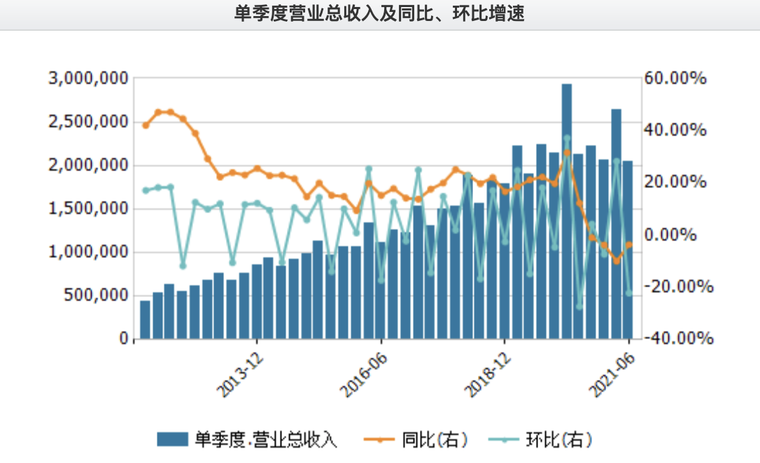 营收方面更为惨淡。2021年上半年,永辉超市实现468.27亿元净收入,同比下滑7.3%,这已经是永辉连续第二个季度营收出现同比下滑,此前的Q1,永辉营收便同比下滑9.99%。对于生鲜超市来说,这是一个非常危险的信号,过去十年,永辉无论是单季度还是年报,都从未出现过营收同比下滑的情况。