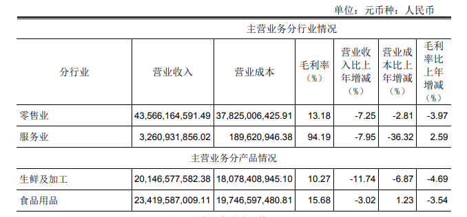 其中,半年报中永辉超市的毛利率同样出现下滑,综合毛利率18.82%,同比下降3.55%,生鲜及加工毛利率10.27%,同比下降4.69%,食品用品毛利率15.68%,同比减少3.54%。