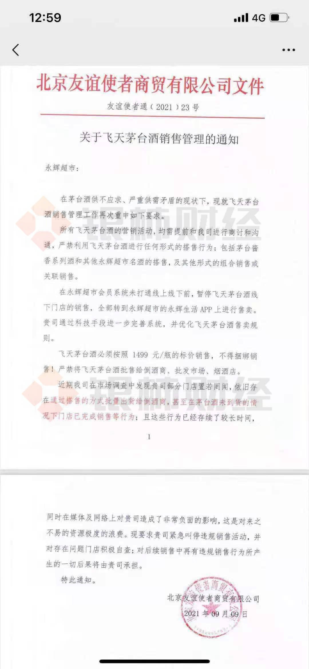 该份文件名为《关于飞天茅台酒销售管理的通知》,落款日期为9月9日,由北京友谊使者商贸有限公司(以下简称:友谊使者商贸)向永辉超市发送。文件主旨是在茅台酒供不应求、严重供需矛盾的现状下,友谊使者商贸就飞天茅台酒的销售管理工作,再次向永辉超市重申要求。