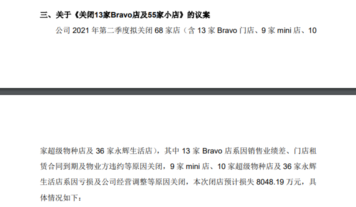 此外,在8月28日发布的《永辉超市股份有限公司第四届董事会第三十一次会议决议公告》中,提到通过了关于《关闭13家Bravo店及55家小店》的议案。该议案显示,2021年第二季度拟关闭68家店,其中13家Bravo店系因销售业绩差、门店租赁合同到期及物业方违约等原因关闭,9家mini店、10家超级物种店及36家永辉生活店系因亏损及公司经营调整等原因关闭,本次闭店预计损失8048.19万元。