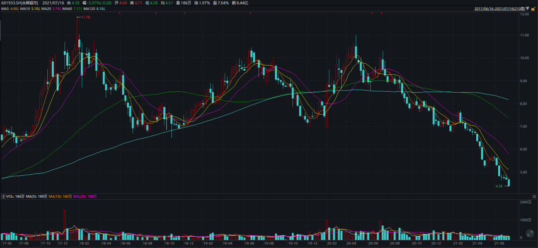 从永辉超市的K线走势图来看,基金对于永辉超市的投资价值判断还是相当准确。近日,永辉超市股价再度跌破4元,市值仅剩378亿元,相较于峰值缩水700多亿。