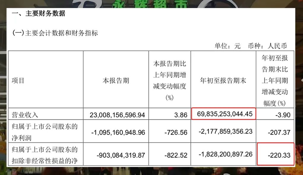 10月29日,永辉超市发布三季报。报告显示,永辉超市前三季度营业收入698.35亿元,同比减少3.9%;净亏损21.78亿元,上年同期净利润20.28亿元,由盈转亏;扣非净利润亏损18.28亿元,同比下降220.33%。