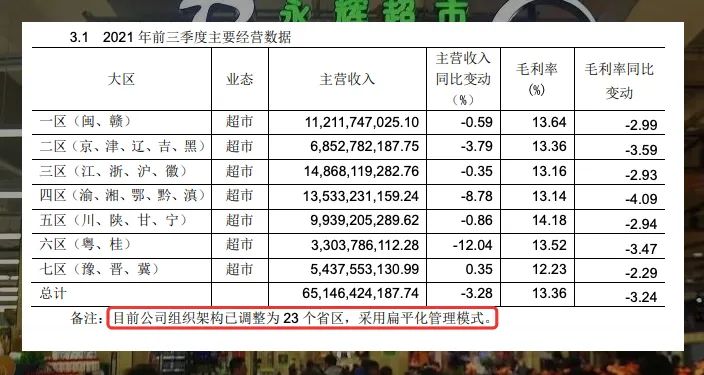 永辉发布2021年三季报:亏损超10亿,全国各地区毛利率集体下滑。