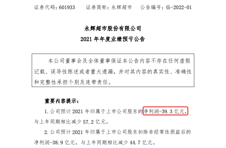 1月28日,永辉超市发布《2021年也业绩预亏公告》,预计2021年净亏损39.3亿元。