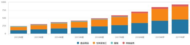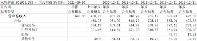 永辉超市布局零售业与服务业,其产品可分为食品用品、生鲜及加工、服装和其他四大类。而其中,零售业收入占总营收的绝大部分,2018-2020年分别为93.12%、92.57%、93.12%,在2021年半年报中则占据93.03%。