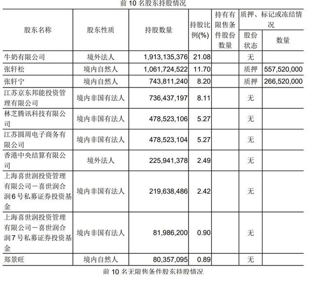 截至2022年3月31日,牛奶有限公司持股为21.08%,张轩松持股为11.7%,张轩宁持股为8.2%,江苏京东邦能投资管理有限公司持股为8.11%;