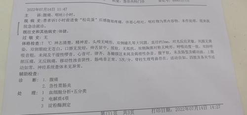 刘先生告诉记者,在市场监督管理局工作人员调查期间,他身体不适症状加重,腹部疼痛难忍,将早上吃的东西都吐了出来,他曾要求店内工作人员陪同他前往医院检查,但对方并没有同意。随后,刘先生自己拨打120叫来了救护车,在120急救人员的建议下,永辉超市工作人员陪同刘先生前往商洛市中心医院就诊。经过医生检查后,刘先生被诊断为腹痛、急性肠胃炎,在医院进行了治疗,花费医药费476元。