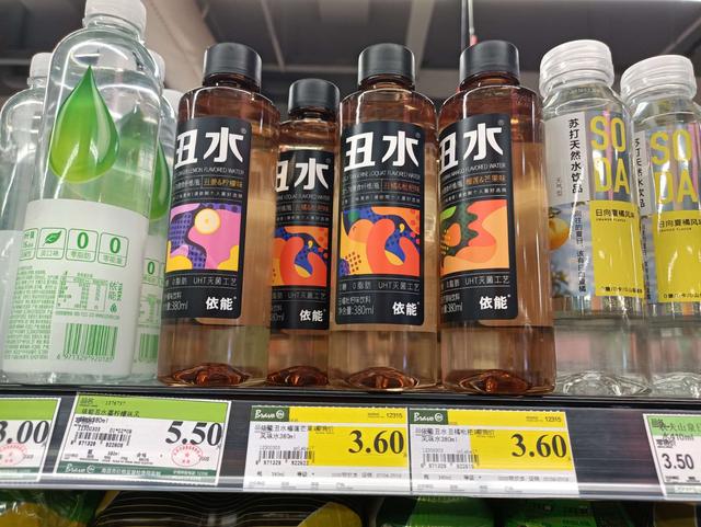 永辉超市铜锣湾店销售的“依能丑水风味水(380ml)”,有两个口味过了促销期,但价格牌未变