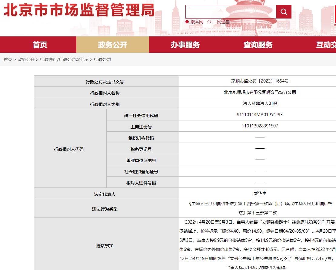 相关处罚信息显示,2022年4月20日至5月3日,当事人(北京永辉超市有限公司顺义马坡分公司)销售“立顿经典醇十年经典原味奶茶S1”开展促销活动,价签标示“标价4.40,原价14.90,促销日期04/20-05/03”。4月20日至5月3日,当事人按9.9元的价格销售5盒,按14.9元的价格销售2盒,按4.4元的价格销售6盒,在标价之外加价出售7盒,多收金额共48.5元。另查明,当事人在2022年4月13日至4月19日期间销售“立顿经典醇十年经典原味奶茶S1”最低价格为7.4元/盒,当事人标示14.9元的原价为虚构。