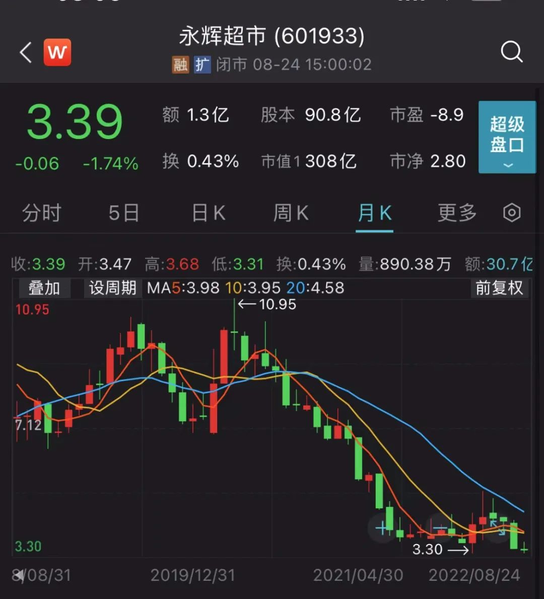 但回购计划公布后,永辉超市股价并未大幅提升。截至8月24日收盘,永辉超市每股报3.39元,市值为308亿元,与最高时的超千亿市值相比,“缩水”700亿元。
