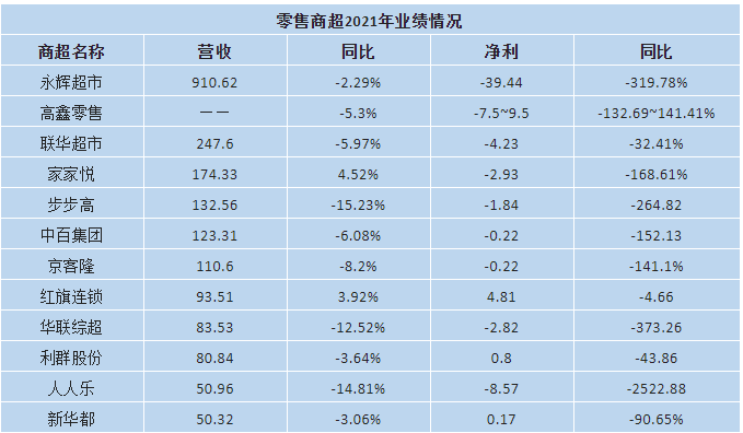 高鑫零售、永辉超市、联华超市、中百集团、家家悦、京客隆、华联综超、人人乐、步步高9家大型连锁超市都陷入亏损。
