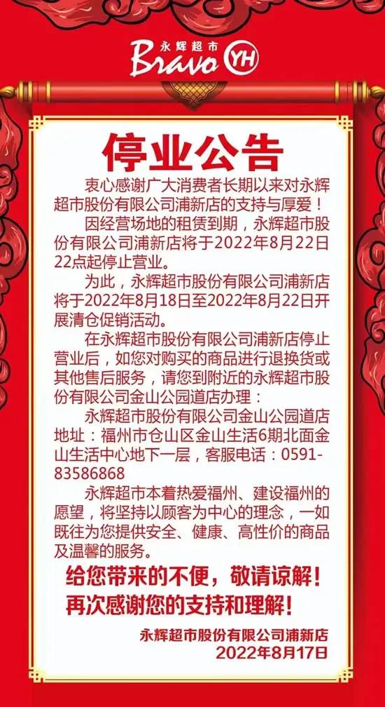 近日,永辉超市位于福建福州的浦新店和西园店相继贴出了闭店公告,其中浦新店将于2022年8月22日22点起停止营业,西园店将于2022年8月24日22点起停止营业。公告中都称,是“因经营场地的租赁到期”。