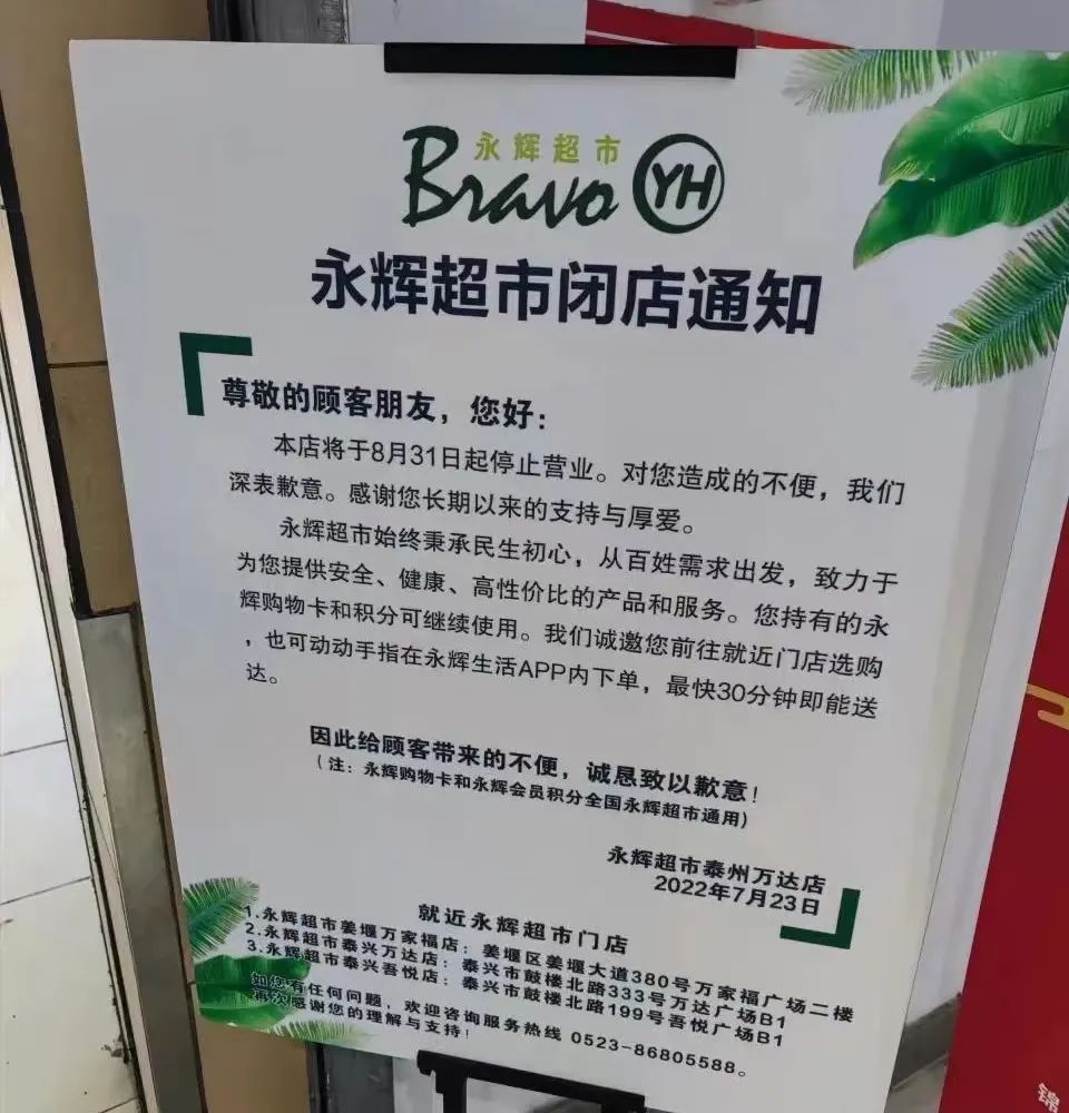 此前,永辉超市泰州万达店发布闭店通知,将于8月31日起停止营业。该店闭通知显示,永辉超市在泰州还有3家门店,其中1家在姜堰,2家在泰兴。泰州万达店客户持有的永辉购物卡和积分可继续到这些门店使用。