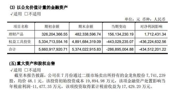 永辉超市在中报中解释了亏损的原因:主要是受到交易性金融资产公允价值下跌的影响,报告期公司持有的金龙鱼与KT因股价下跌确认了4.36亿元公允价值变动损失。为了减金融资产价格波动对公司业绩影响,公司索性对所持金龙鱼的股票做了清仓处理。公司在中报中透露,公司在7月份通过二级市场卖出所持有的金龙鱼股份774.12万股,均价48.1元。公司还特意告知投资者,其实公司这笑投资并没有亏损:该投资初始投资成本1.99亿元。该项金融资产处置影响当年税前利润-1.15万元,该项投资取得累计税前收益为1.74亿元。