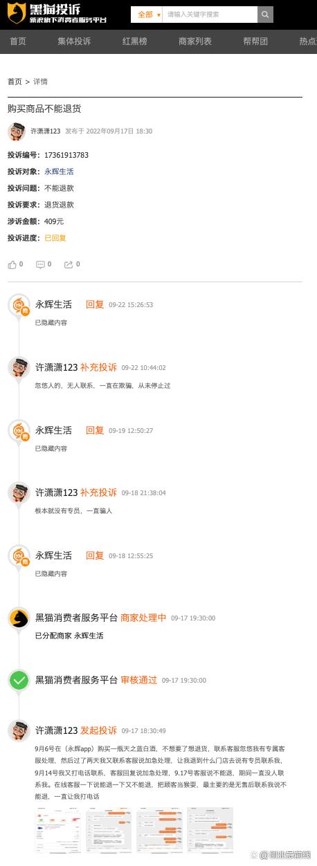 其中一名消费者表示,“9月6号在(永辉app)购买一瓶天之蓝白酒,不想要了想退货,联系客服忽悠我有专属客服处理,然后过了两天我又联系客服说加急处理,让我退到什么门店去说有专员联系我,9月14号我又打电话联系,客服回复说加急处理,9月17号客服说不能退,期间一直没人联系我。在线客服一下说能退一下又不能退,把顾客当猴耍,最主要的是无售后联系我说不能退,一直让我打电话。”