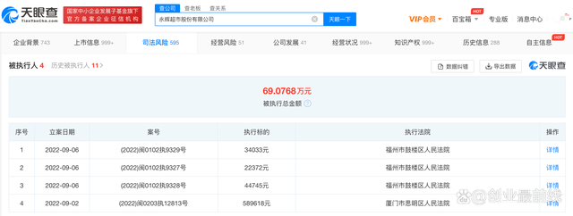 值得注意的是,永辉超市在2022年9月2日、6日,四次被福州市鼓楼区人民法院列为被执行人,被执行金额69万元。