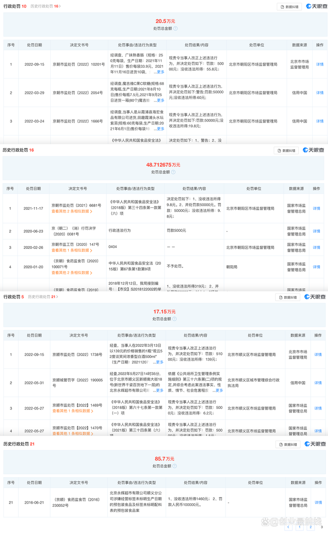 值得一提的是,从2015年12月14日到2022年9月15日,朝阳永辉共受到行政处罚26次,处罚金额超69万元;从2016年6月21日到2022年9月15日,顺义永辉共受到行政处罚26次,处罚金额超102万元。以上所受处罚主要原因大多均与食品安全问题相关。