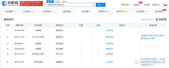 从2007年到2018年5月,永辉超市共计进行了6轮融资。2010年12月15日,成功IPO上市,交易金额26.38亿人民币。后又完成了两轮股权转让:2017年12月16日,投资方腾讯投资,交易金额42.15亿人民币;2018年5月23日,投资方京东科技,交易金额未披露。