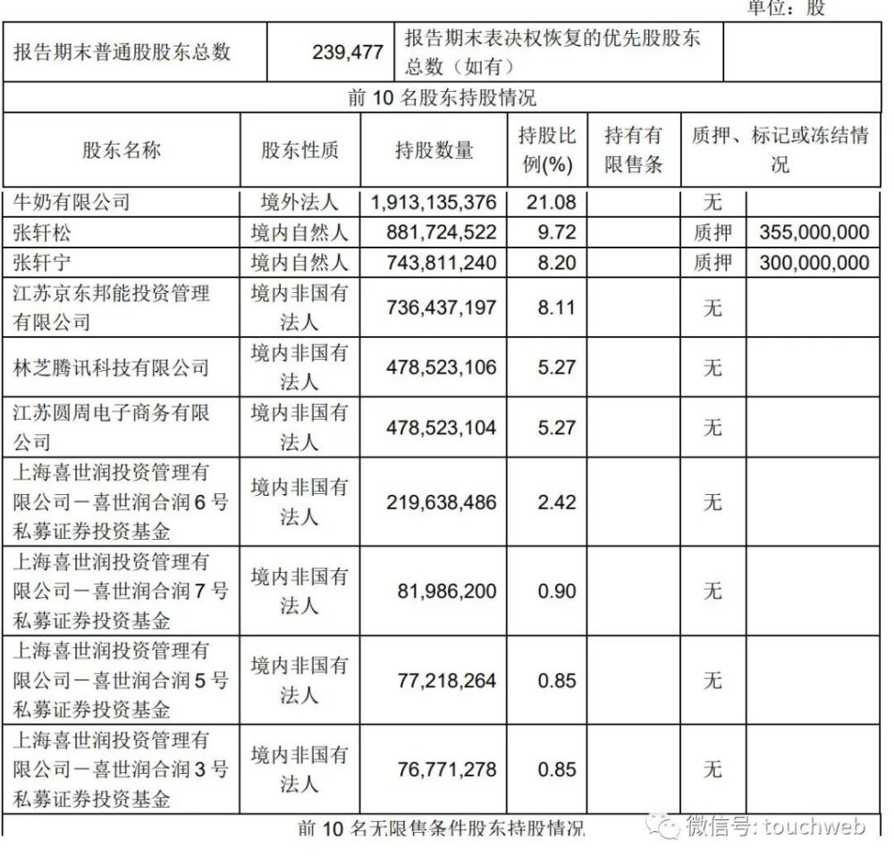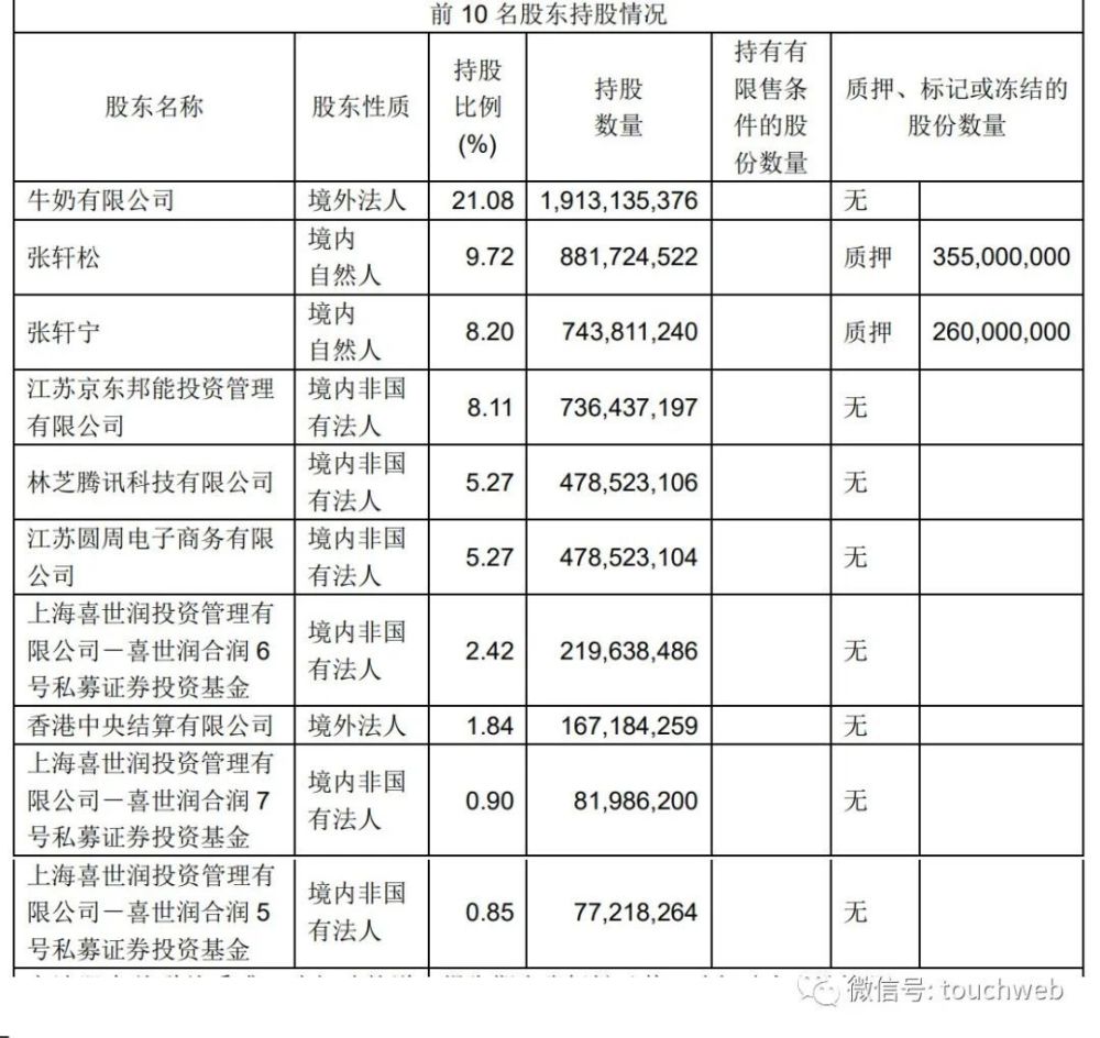 截至2022年6月30日,牛奶有限公司持股为21.08%,张轩松持股为9.72%,张轩宁持股为8.2%,江苏京东邦能投资管理有限公司持股为8.11%,林芝腾讯科技有限公司持股为5.27%,江苏圆周电子商务有限公司持股5.27%,