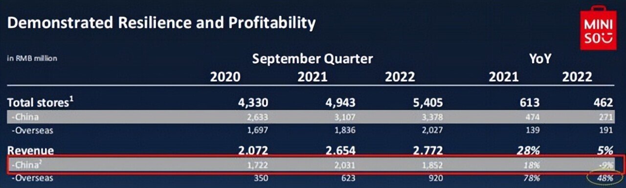 由于海外市场的强劲增长,名创优品实现了营收正增长。但在国外营收亮眼的光环下,国内营收不显眼的“-9%”数据反而被淡化、隐藏了。