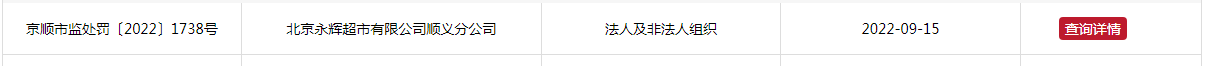 中国质量新闻网查询北京市市场监督管理局网站发现,自今年9月以来,北京永辉超市有限公司多家分公司累计11次被市场监管部门处罚。以11月为例,11月23日,北京永辉超市有限公司海淀清河分公司所售产品混有刷子毛、小虫、头发等异物,违反《食品安全法》被罚1万元;11月7日,北七家分公司违反《产品质量法》被罚26301.6元并被没收违法所得;11月4日,房山长阳分公司销售由山东彭顺食品有限公司生产的“君味爽”鸭血,产品里面含有水成分,属于生产加工过程中人为添加,在其产品标签中未标注产品固形物含量,不符合GB7718强制规定,属于标签不符合规定的预包装食品,被罚5000元;北京房山分公司因违反《中华人民共和国食品安全法》(2021版)和《食用农产品市场销售质量安全监督管理办法》相关规定被罚5万元;11月3日,丰台区西铁营分公司则因违反《中华人民共和国食品安全法2015版》和《食用农产品市场销售质量安全监督管理办法》相关规定被罚2万元(见下图)。