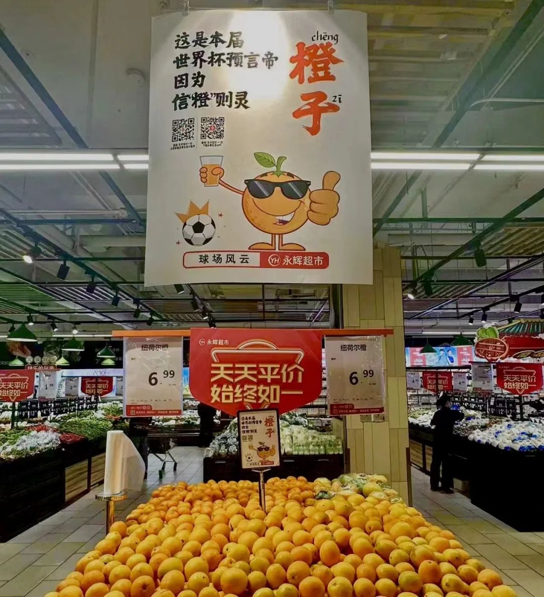 也有玩起了世界杯“谐音梗”的水果。如“这是本届世界杯预言帝,因为信‘橙’则灵”的橙子;