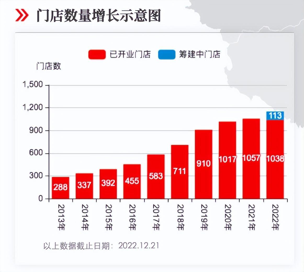 据永辉超市官网显示,2022年永辉超市的门店数量近10年来首次出现减少的情况,2021年他们的门店数量是1057家,2022年12月21日他们的门店数量是1038家,此外还有113家门店在筹建中。