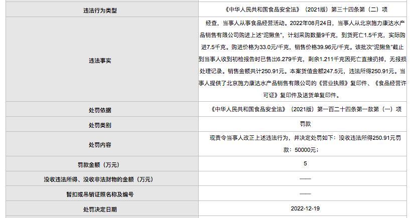 12月21日消息,北京永辉超市有限公司顺义马坡分公司在12月19日被北京市顺义区市场监督管理局给予了行政处罚,没收了违法所得250.91元,并罚款5万元。