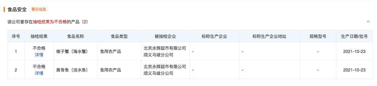 2022年1月25日,北京市顺义区市场监督管理局对以上两种抽检不合格的产品给予北京永辉超市有限公司顺义马坡分公司没收违法所得3236.44元,并罚款5万元的行政处罚。