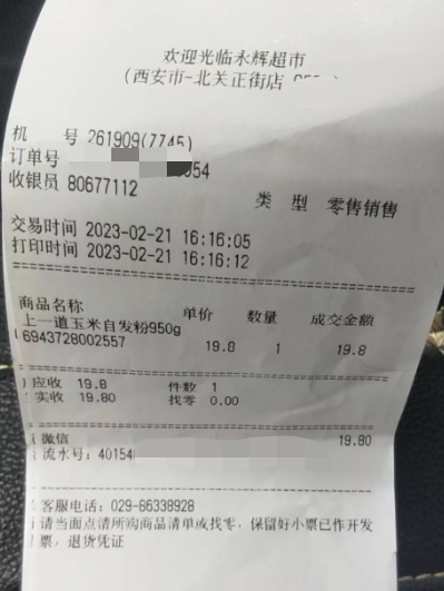 网传图片显示,宗先生购买的是一款“玉米自发粉”,主要用来馒头等面食的制作。发票显示,宗先生购买的时候是2月21日下午4时许,重量为950g,售价为19.8元。售卖该面粉的店家是永辉超市西安北关正街店。