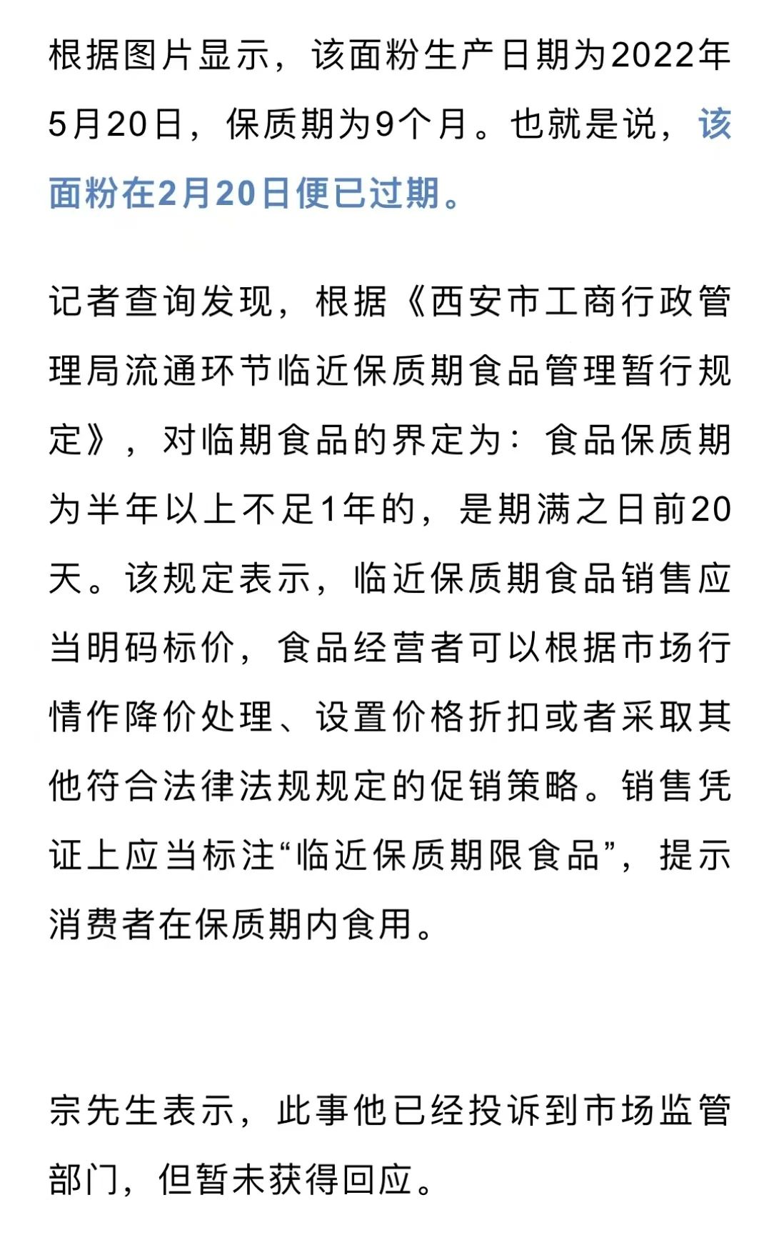 2月26日,又有网友爆料称西安一永辉超市售卖过期的玉米自发粉。网传图片显示,该玉米粉生产于2022年5月20日,保质期有9个月。当事人宗先生告诉记者,他买的时候是21日。