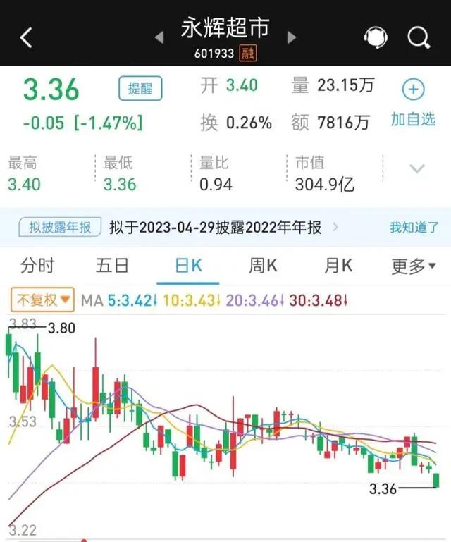 二级市场上,永辉超市上周五最新收报3.36元,跌1.47%,公司目前总市值304.9亿元。