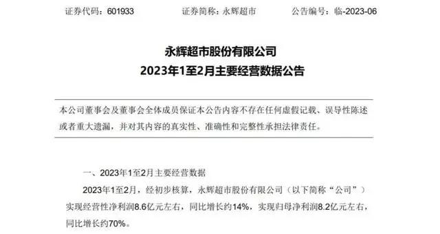 永辉超市(601933)3月12日晚间发布2023年1至2月主要经营数据,经初步核算,公司前两月实现经营性净利润8.6亿元左右,同比增长约14%,实现归母净利润8.2亿元左右,同比增长约70%。