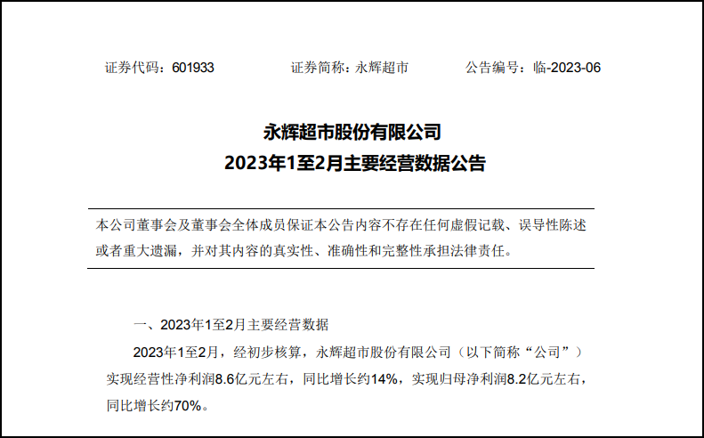根据永辉此前发布的公告,永辉超市2022年上半年已实现盈亏平衡,扣非后归母净利润达0.94亿元,由此可见亏损主要是受去年下半年影响。