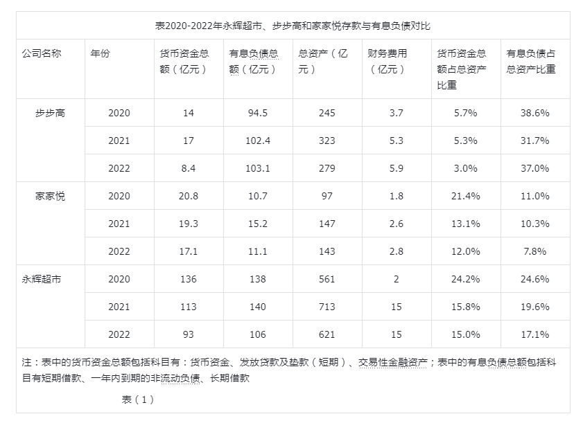 我们根据经营模式挑选出步步高和家家悦作为相关可比公司,来看下同行业内相关上市公司的存款与有息负债对比情况,详细数据见表(1)。