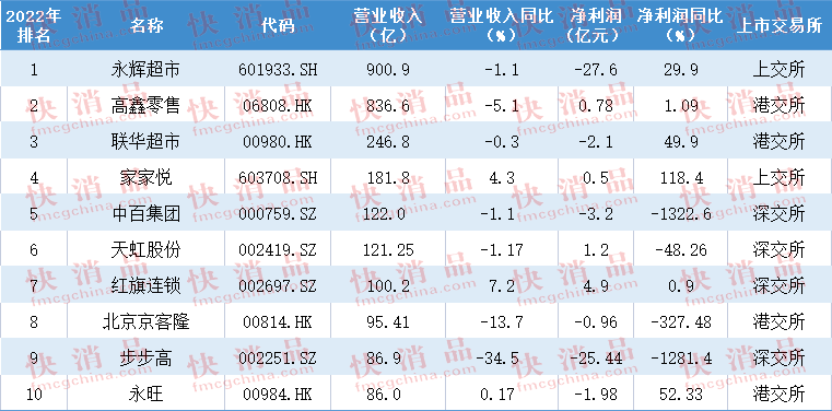 上海市东方世纪消费品发展促进中心(简称:“东方快消品中心”)携行业领先全媒体--《快消品》汇总了在上交所、深交所、港交所、北交所上市的300余家大快消相关公司2022年业绩,按品类并通过主要经营指标——营业收入进行排名,公布“2022年大快消上市公司细分品类10强”。此次,《快消品》带来:2022年中国大快消上市公司之商超10强。