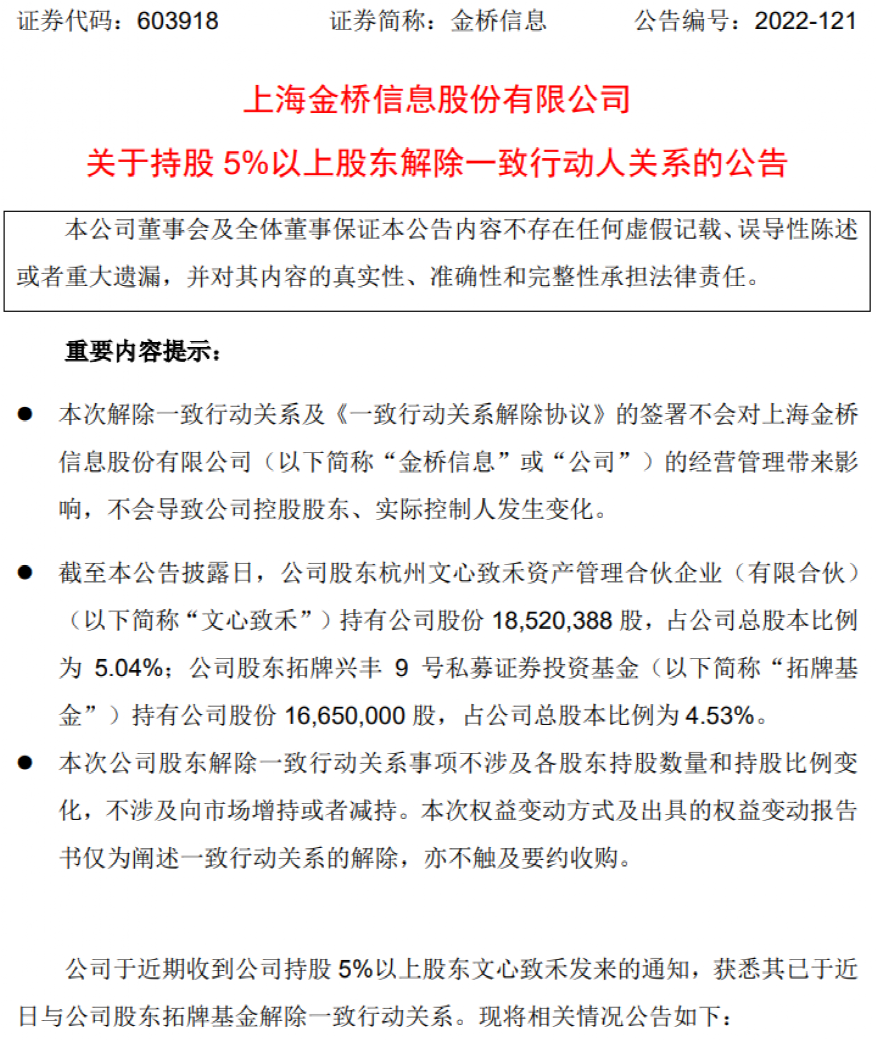 2021年11月,金桥信息公告,持股5%以上股东杭州文心致禾资产管理合伙企业,将拓牌兴丰9号私募基金增加为一致行动人,并在一致行动人之间内部转让其持有的部分公司股份。