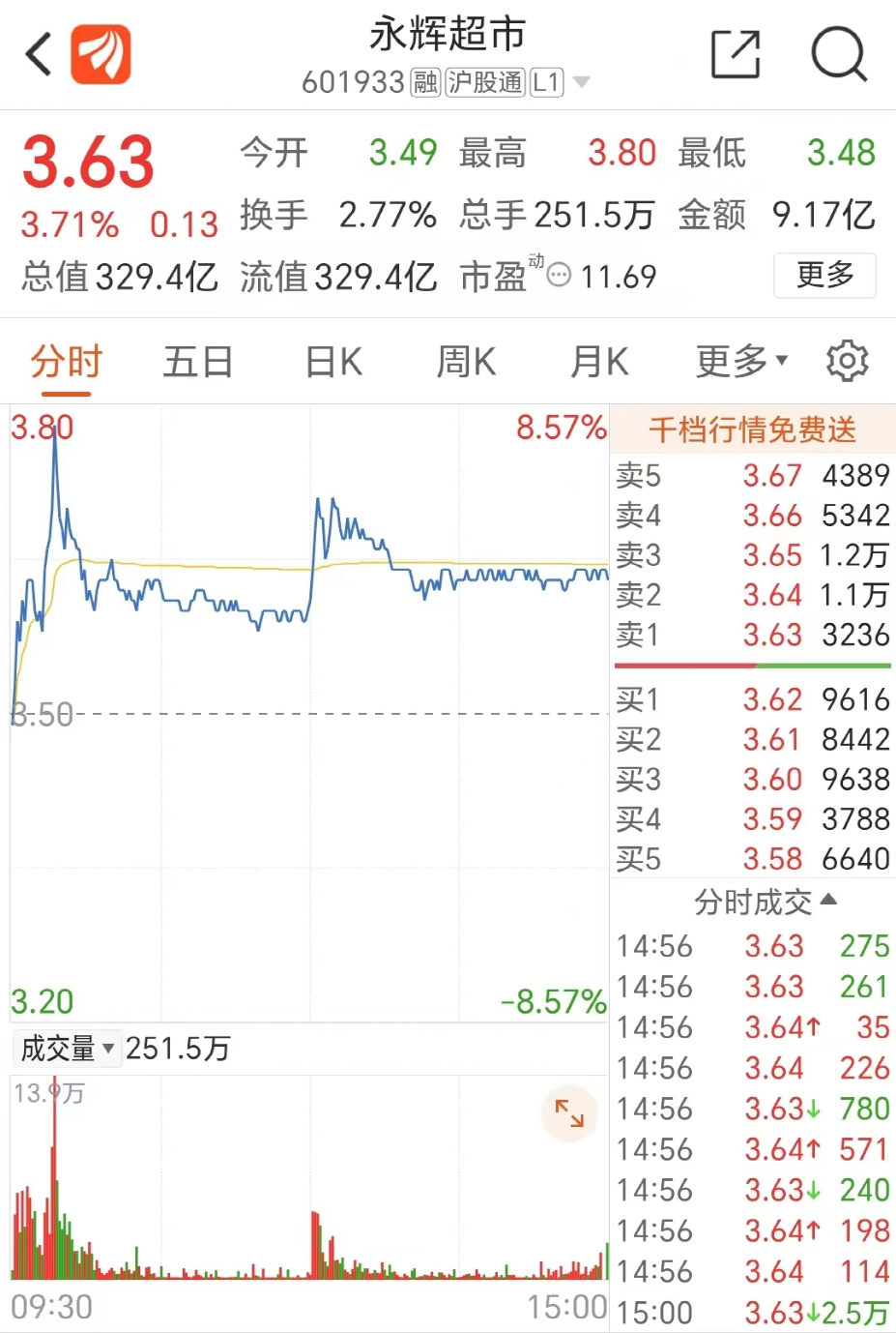 8月1日,受上述消息刺激,永辉超市股价一度大涨8%,最终以3.71%的涨幅收盘,目前股价为3.63元、市值329亿。