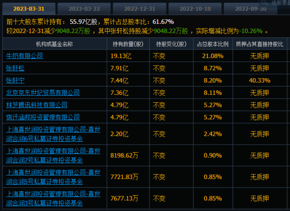 在股权构成方面,截止今年一季度,牛奶有限公司为永辉超市第一大股东,持股比例为21.08%;创始人张轩松为第二大股东,总股本比例为8.72%;张轩松及其一致行动人合计持有股份14.56%,目前永辉超市为无实际控制人状态。