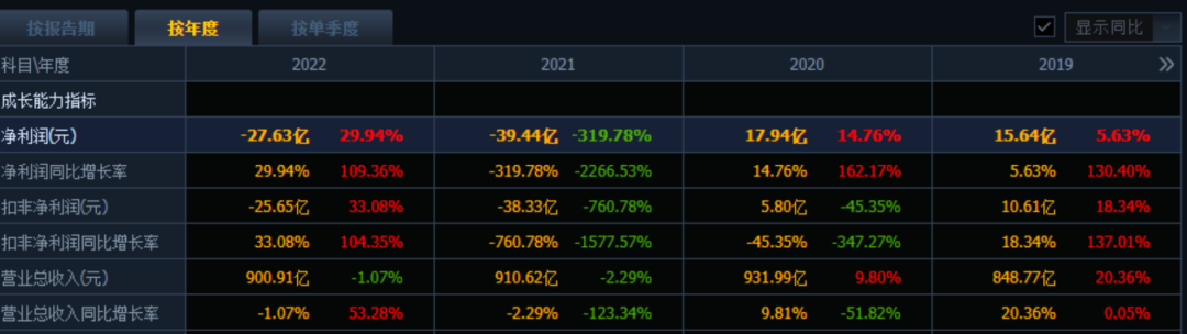 2022年,永辉超市实现营业收入900.91亿元,同比下降1.07%;净利润亏损27.63亿元,去年同期亏损39.44亿元,也就是说,两年亏损了60多亿。