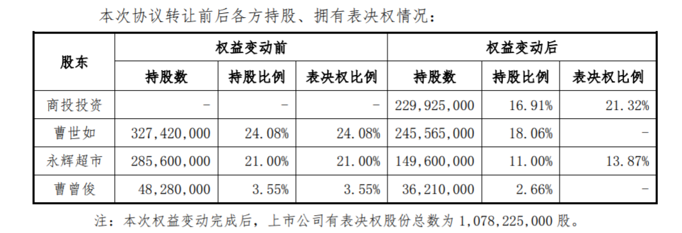红旗连锁公告显示,红旗连锁接到实控人曹世如及其一致行动人曹曾俊通知,为实现公司长远发展,曹世如、曹曾俊及永辉超市与商投投资签署了《股份转让协议》,约定三者将其合计持有的红旗连锁2.3亿股(占红旗连锁总股本的16.91%),以协议转让的方式转让给商投投资,转让价格5.88元/股,金额合计达13.52亿元。