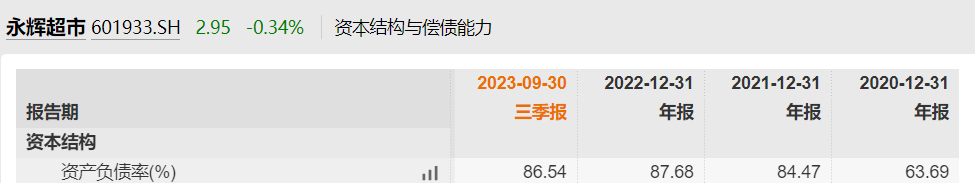 根据永辉超市2023年第三季度报告显示,截至2023年9月30日,永辉超市的货币资金为67.95亿元,而短期借款47.63亿元、一年内到期的应付账款高达99.23亿元。据Wind数据,2020年至2023年9月,永辉超市资产负债率分别为63.69%、84.47%、87.68%、86.54%,直追房地产开发商,永辉超市面临的流动性风险跃然纸上。