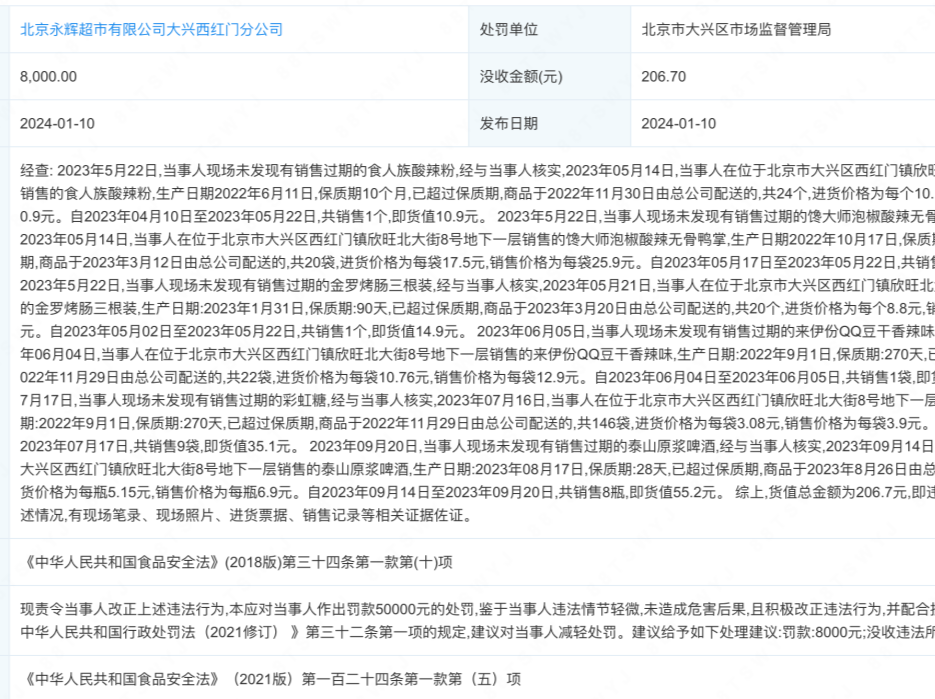 近日,北京永辉超市有限公司大兴西红门分公司(以下简称“永辉超市”)因违反食品安全法,被北京市大兴区市场监督管理局罚款8000元,并没收违法所得。