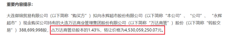 具体来看,永辉超市在2023年底就曾发布公告称,大连御锦贸易拟向永辉超市现金购买公司持有的大连万达商管1.43%股份,转让价格为45.30亿元。对此,永辉超市解释是为了盘活公司资产,符合公司缩小投资规模战略。